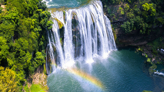 1.黄果树大瀑布,为黄果树瀑布群中大而壮观的瀑布,宽101米、高77.8米。可以从上、下、前、后、左、右、里、外八个方位观赏。通过从瀑布后自然贯通的水帘洞能从洞内外听、观、摸瀑布。每当水量充沛时,黄果树瀑布便如银河倾泻,水声震耳欲聋,气势磅礴,令人叹为观止。瀑布后有一长达134米的水帘洞拦腰横穿瀑布而过,穿过水帘洞,仰望大珠小珠落玉盘。